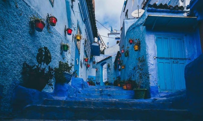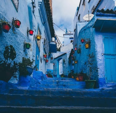 Today’s journey unfolds through scenic landscapes as you head north into the Rif Mountains. Rolling hills and quiet villages lead you to the enchanting town of Chefchaouen, famously known as the Blue Pearl. Upon arrival, the atmosphere shifts—soft, peaceful, and deeply poetic. Wander through narrow streets washed in shades of blue, where doors, steps, and walls reflect changing light throughout the day. Local life moves gently here: artisans crafting textiles, children playing in hidden squares, and cafés offering mint tea with mountain views. As sunset paints the hills in gold, Chefchaouen reveals its magic—quiet, contemplative, and unforgettable.