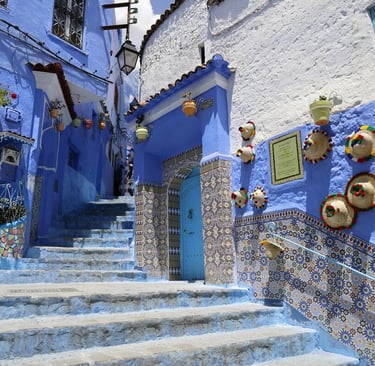 This morning, explore Tangier’s historic medina, where narrow streets lead to panoramic viewpoints over the Strait of Gibraltar. Continue to Cap Spartel and the legendary Hercules Caves, where myth and nature intertwine dramatically. Leaving the coast behind, the landscape transforms as you travel inland toward the Rif Mountains. By afternoon, arrive in Chefchaouen, the famed blue city. Nestled among green hills, Chefchaouen offers a peaceful, almost dreamlike atmosphere. Spend the evening wandering its blue-washed alleys, discovering local crafts, and enjoying traditional mountain cuisine. Overnight in a charming riad surrounded by serenity.